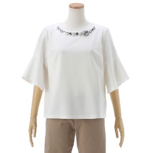キラキラと輝く大ぶりのビジューが、華やかなムードたっぷりのプルオーバー。ヒラリと揺れるフレアスリーブで、女性らしいシルエットに仕上げています。引き手にリボンをあしらった、後ろのファスナーもリッチなアクセントに。なめらかなポンチ素材を使用しているので、大人っぽく着こなせます。(着用商品は13号) …